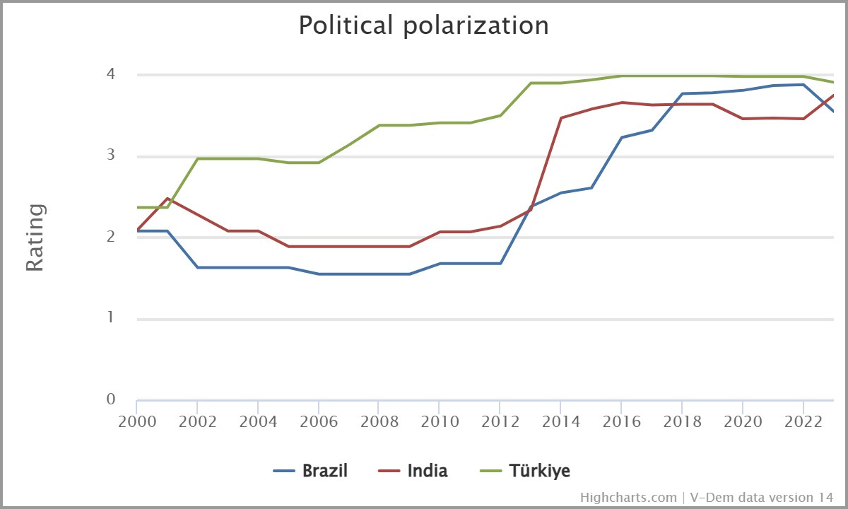 You may have heard how polarized the world is today. Hindus vs muslims, upper castes vs Marathas vs dalits, whites vs blacks, left vs right—along all of these axes, things are much worse than they were 20 years ago. This is not just my opinion—there’s data backing this claim. Take a look at this graph.